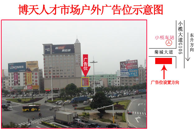 该广告位于中山市小榄镇菊城大道东1号(即小榄车站对面,小榄大道与菊城大道交汇处),视野宽,广告位尺寸:高12米×宽8米,地理位置优越,人流量和车流量大,价格优惠,拥有此广告位体现贵企业实力强大,广告效果好,广告效益价值高,有意者请致电:18925339018